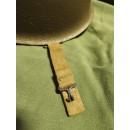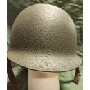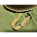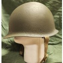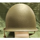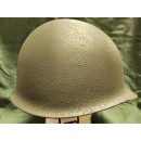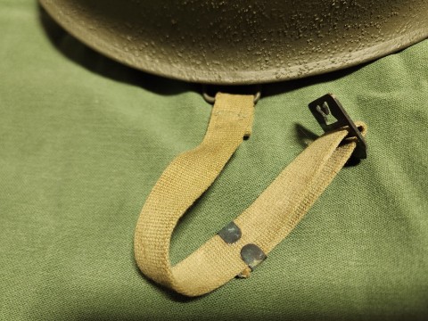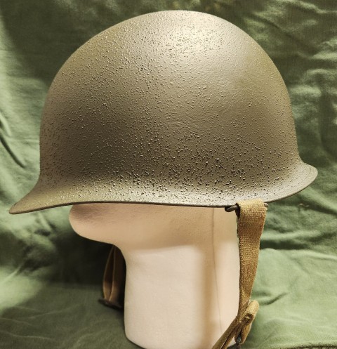 WWII era shell. This is a nice original M1 Helmet Shell. Steel Pot has original texture and has been repainted. Helmet shell is a rear seam, flexible bale and has original OD#3 (khaki) chinstraps sewn on to the shell. The chinstraps are the mid war style and appear to be original to the helmet or at least a period replacement.