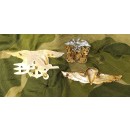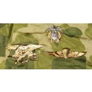 This is an insignia lot from the estate of CDR Nelson. The lot consists of his SEAL Trident, Naval Parachutist Qualification Badge and his Commissioned Officer Hat Device. The trident is Hallmarked V-21-N. The Parachutist Qualification is Hallmarked V-21-N as well. The Officer's Hat Device is Hallmarked H-24-N The devices all appear to have some light glue residue on the back (I suspect he had mounted them to a retirement display). The Trident has one missing attachment point and one bent one. The Parachutist Qual is missing both of its attachment pins. Despite the damaged / missing pins, this is a named lot with provenance and that is rare and hard to come by.
